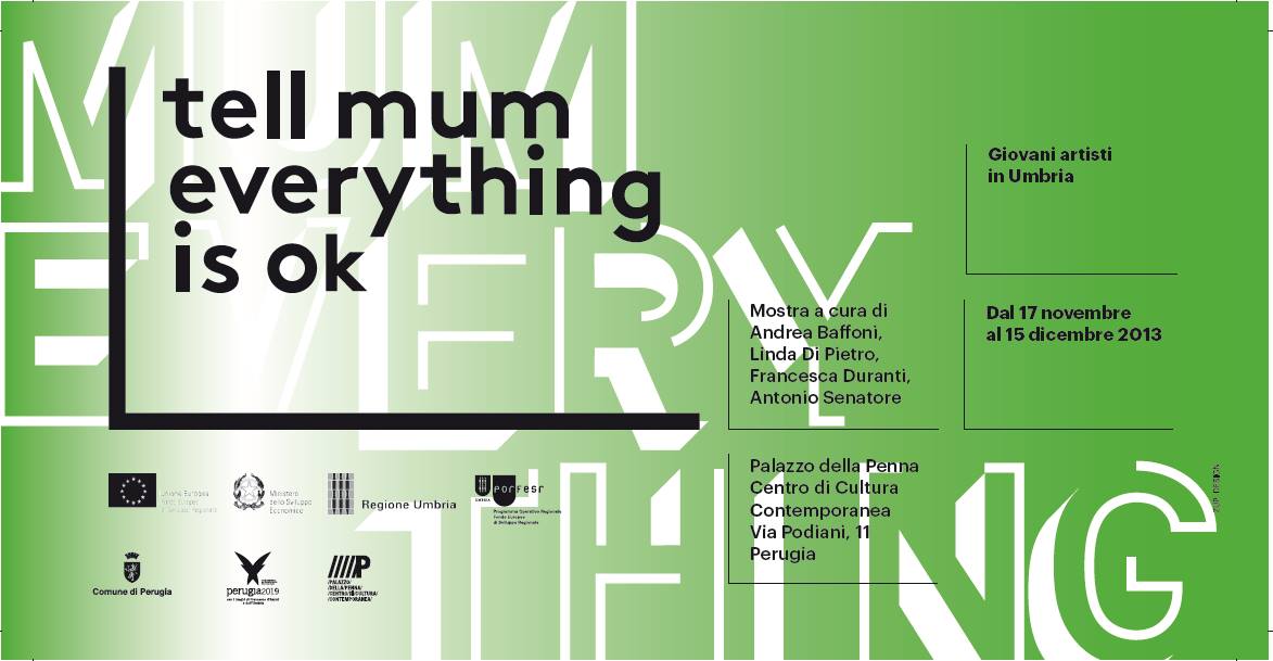 La mostra “Tell mum everything is ok”, a cura di Andrea Baffoni, Linda Di Pietro, Francesca Duranti e Antonio Senatore, offre uno spaccato dell’attuale panorama artistico in Umbria, attraverso un percorso che dialoga con la sede espositiva diffondendosi in tutti gli spazi del complesso, comprese le collezioni permanenti. Una fantasmagoria di opere pittoriche, scultoree, installative, performative e di videoarte che riassume l’eccellenza degli artisti emergenti.