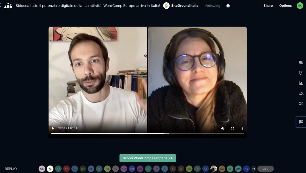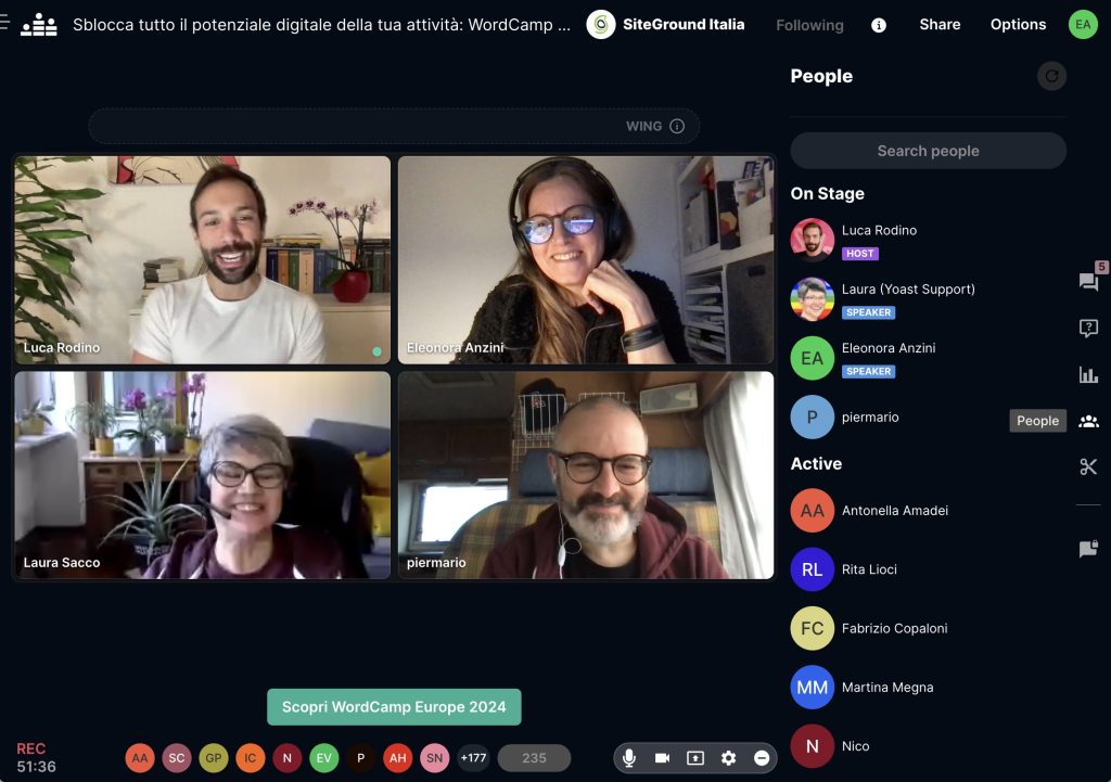 Martedì 23 aprile sono stata ospite di Luca Rodino con Laura Sacco e Piermario Orecchioni al webinar di SiteGround Italia come organizzatore del WordCamp Europe 2024, il più grande evento WordPress al mondo che quest’anno arriva in Italia! Alcuni screenshot e il link per il replay!